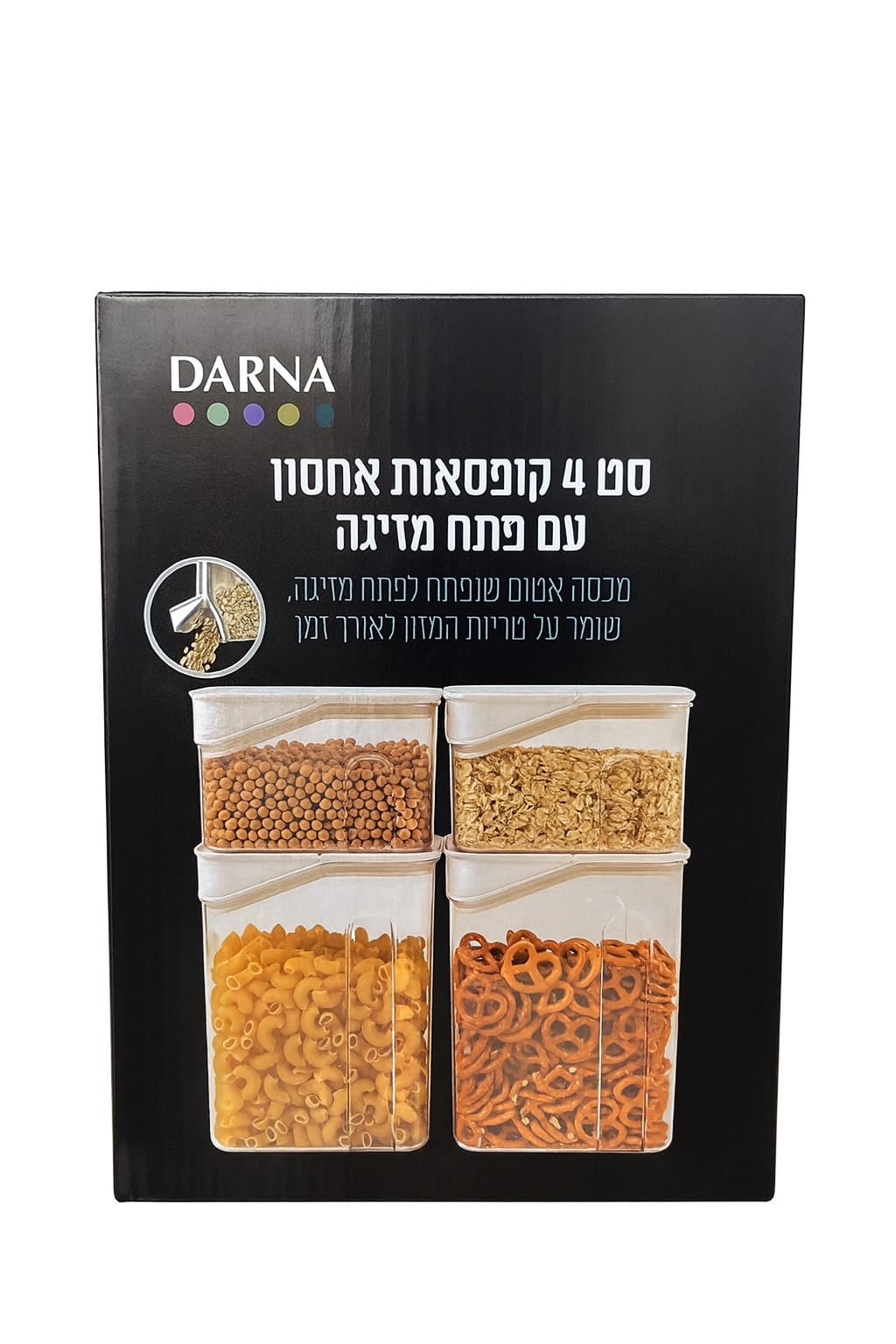 סט 4 קופסאות אחסון פרקטיות עם פתח מזיגה נוח, לשמירה על טריות המזון. מכסה אטום המאפשר מזיגה ישירה של דגנים, קטניות, פסטה ועוד. מתאים לשימוש במקרר, במדיח ובמקפיא.